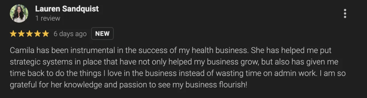 Camila is an amazing business coach who meets me exactly where I’m at in every session and tailors her guidance to my unique needs. She keeps me on track with actionable steps and provides unwavering support as I launch my business. Her sessions are never cookie-cutter; everything is personalized to help me succeed. Camila’s genuine enthusiasm and encouragement make her the ultimate cheerleader for my business journey!